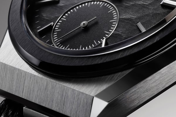 ミラーとヘアラインで磨き分けられ、面の美しさが際立ったステンレススティールケースはCal.0200を搭載するモデルすべてに共通する特徴だが、この時計ならでの見どころは、やはりダイヤルだろう。槌目(つちめ)模様を思わせる凹凸が、波打つ水面のような印象をもたらしている。光が当たる角度によって生まれる大胆な陰影には思わず見惚れてしまった。これには既存モデルと同じく電鋳の技法が用いられている。マスターモデル(母材)の表面に電気化学反応を利用して厚いメッキを施し、それを剥離。マスターモデルとは反対面の形状を作る技法だ。これはもともとマスターモデルの形状や表面の凹凸を極めて忠実に再現することができる技法だが、本当に金槌を打ちつけているようにしか見えないほどの質感を持っている。